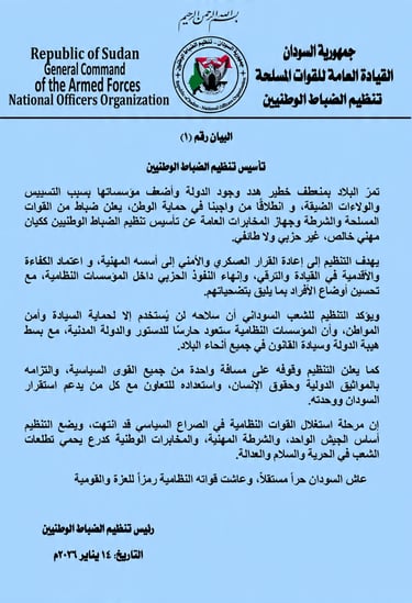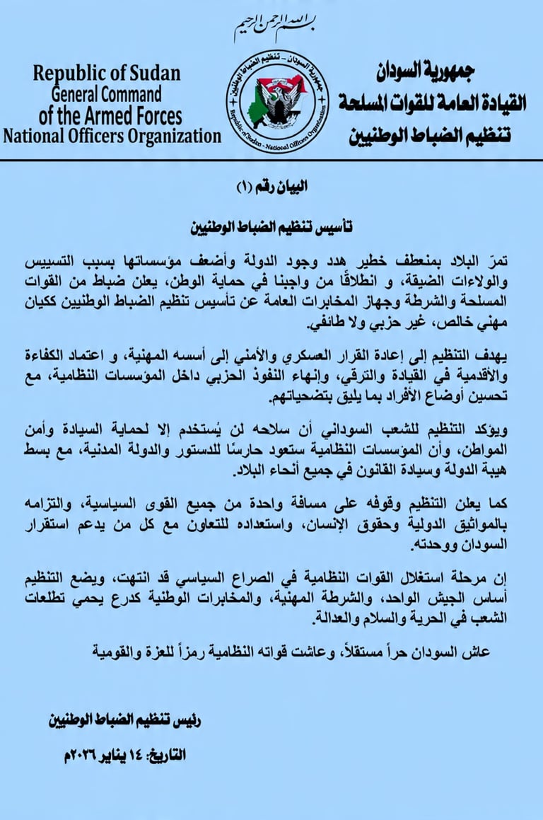 استشعاراً للمسؤولية التاريخية تجاه الدولة السودانية، و إيماناً بأن قوة الوطن تبدأ من وحدة واحترافية مؤسساته النظامية، و تأكيداً على ضرورة نأي هذه المؤسسات عن الصراعات الحزبية و الأيديولوجية؛ تم تأسيس هذا التنظيم ليكون الضامن لوحدة القوات النظامية و صمام أمان لحماية التراب الوطني والمواطن.